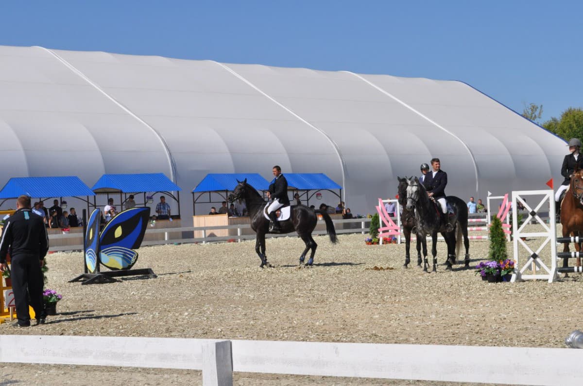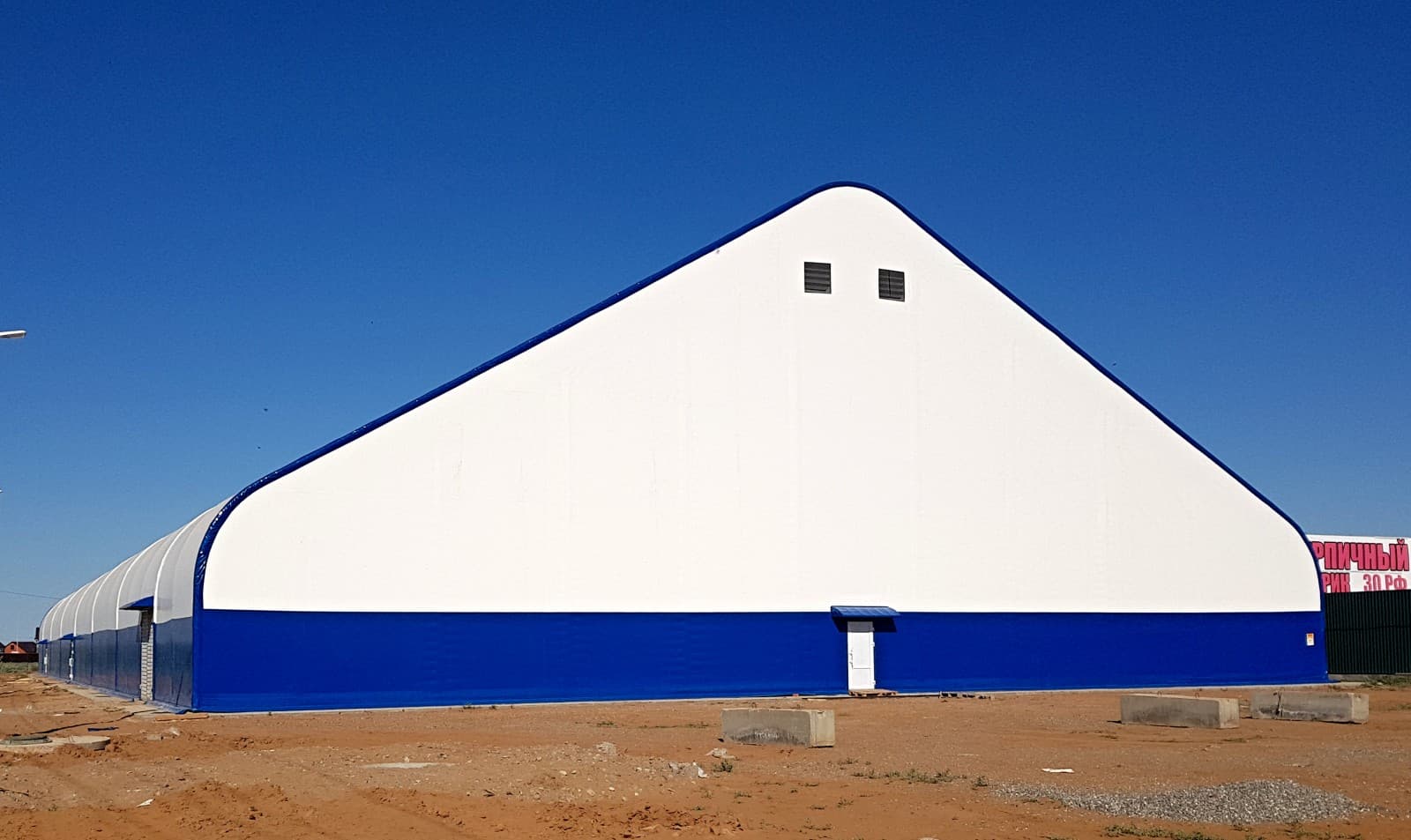При возведении закрытых объектов мы используем металлоконструкции из профильных труб с антикоррозийным покрытием и высокопрочную тентовую ткань из ПВХ (поливинилхлорида), которая обладает следующими свойствами: морозостойкость, огнезащита, простота в эксплуатации. Воздушная прослойка в двухслойном материале из ПВХ позволяет удерживать тепло внутри постройки.