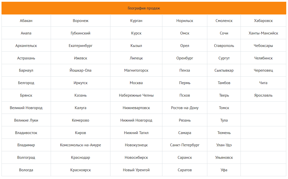 | Абакан | Воронеж | Курган | Норильск | Смоленск | Хабаровск |