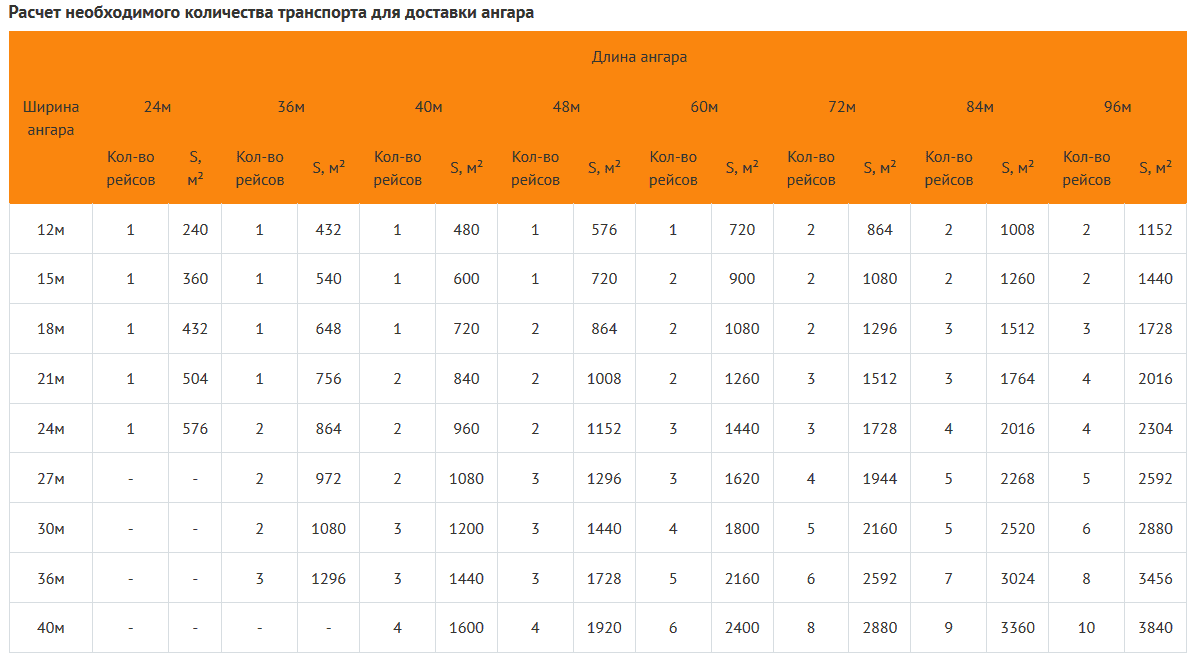 Предлагаем вам таблицу, по которой вы сможете определить, какое количество рейсов понадобится вам для того, чтобы перевезти комплект ангара на свой участок и, соответственно, рассчитать стоимость доставки товара.